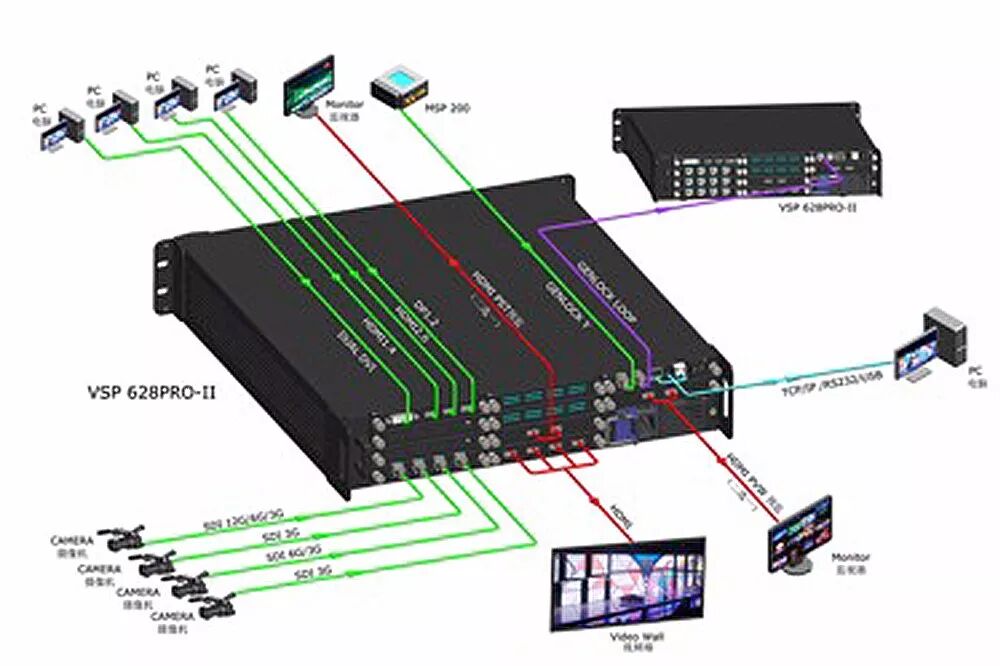 同样的VSP 628PRO II并非只支持4K输入输出,它也是完全向下兼容的,即输入输出还是可以继续支持2K级别的输入和输出,完全兼容现有的2K级别的前端和后端设备。